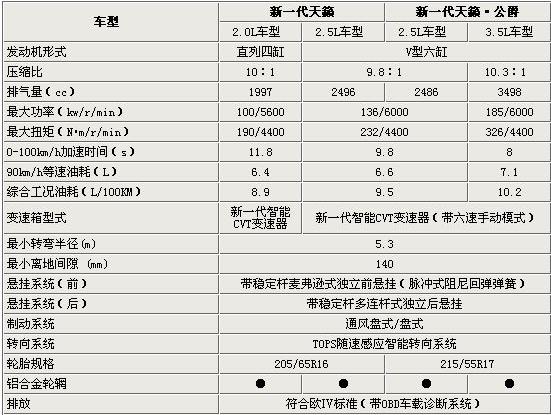 在發(fā)動機(jī)方面,新一代天籟車型采用了日產(chǎn)全球十佳VQ發(fā)動機(jī),其最大功率和最大扭矩均有明顯提升。其中3.5排量車型百公里加速僅為8秒,而2.5車型的百公里加速也到達(dá)了10秒以內(nèi)。另外2.5和3.5排量車型均配備了帶有6速手動模式的CVT無級變速箱,在增加駕駛樂趣的同時,也使新天籟的油耗降到了最低。新天籟離地間隙達(dá)到了140mm,在道路通過性上有了的明顯提升,也同時使天籟更加適合了中國的復(fù)雜路況。