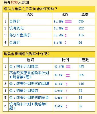 這一政策的出臺,迫使汽車企業(yè)將眼光更多的轉(zhuǎn)向私人用車市場,然而,面對災(zāi)難深重的中華大地,又有多少中國人會考慮此刻購車呢?根據(jù)最新調(diào)查顯示,42.87%的網(wǎng)友將購車計劃推遲,61.3%的網(wǎng)友認為地震之后汽車將會降價。