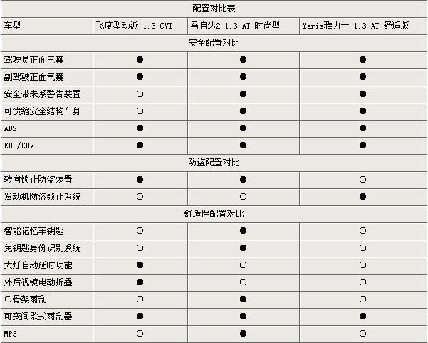 在配置的設(shè)置上筆者選取了幾個(gè)比較基礎(chǔ)的方面,在基礎(chǔ)安全方面我們可以看到馬自達(dá)2和雅力士做的都還不錯(cuò),而飛度之所以有少許的欠缺也是因?yàn)樗鲜刑绲囊蛩,可?jiàn)日系車(chē)對(duì)于安全方面的重視做的越來(lái)越到位了。