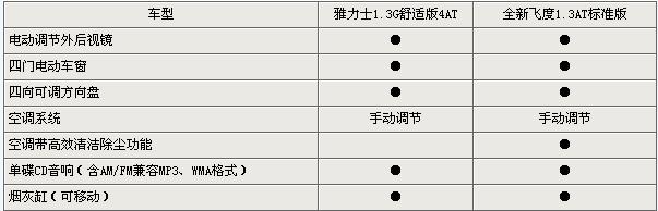 從上面的圖表對比可以看出,為了適應(yīng)潮流步伐和迎合年輕消費者的口味,新飛度和雅力士在音響系統(tǒng)方面,都安裝了CD,而且兼有MP3、WMA格式。在新飛度上空調(diào)加裝了可除塵功能。