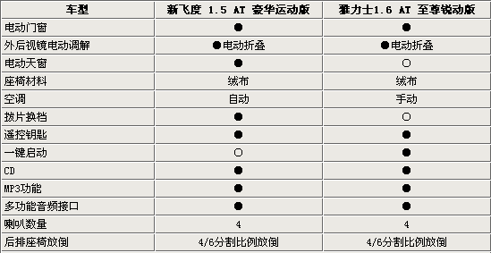 新飛度(參數(shù)配置 圖庫)和雅力士雖然作為緊湊型A0級(jí)轎車,但是在舒適配置方面卻完全不輸給中高級(jí)轎車。雅力士配備了中高級(jí)轎車才配備的一鍵啟動(dòng)按鍵,使得整車檔次有所提升。而新飛度則更是厲害在配備了自動(dòng)空調(diào)的同時(shí),還配備了高級(jí)轎車上才可以見到的撥片換檔器,使得該車更加具備了運(yùn)動(dòng)氣息。兩款車型都標(biāo)配了帶有MP3功能的單碟CD,并且同時(shí)都具備多功能音響接口。讓人頗感遺憾,雅力士高配車型沒有配備電動(dòng)天窗。