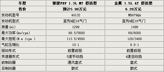 駿捷FRV(參數(shù)配置 圖庫) 1.3L采用三菱4G13S發(fā)動機,雖然排量僅為1299ml,但最大功率的輸出可以達到 68.5kw/5600rpm,這與吉利金鷹1.5L發(fā)動機的性能參數(shù)相差無幾。除此以外,駿捷FRV的制動系統(tǒng)采用前通風盤式后鼓式,相比吉利金鷹的前盤后鼓式制動加大了制動系統(tǒng)的散熱性。還有一點區(qū)別就是兩款車的變速箱,駿捷FRV采用5速手動變速箱,吉利金鷹采用4速自動變速箱。相比之下,駿捷FRV在油耗和駕駛樂趣方面會好于對手,而吉利金鷹所配備的自動變速箱卻可以讓操控更加舒適、簡潔。