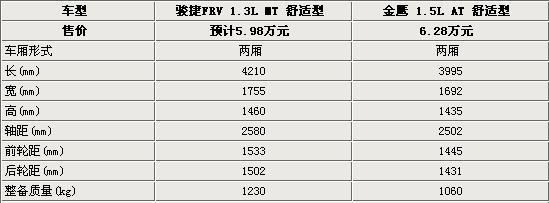 駿捷FRV(參數(shù)配置 圖庫)作為華晨今年的重要車型,終于在5月底上市,而駿捷FRV系列的1.3L車型也將在本月15日推出市場,以此來擴大產(chǎn)品范圍。從之前網(wǎng)上車市網(wǎng)站得到的資料來看,駿捷FRV 1.3L只推出1.3L 舒適型一款車型,預計售價為5.98萬元。隨著這款車上市日期的臨近,很多消費者也對其表現(xiàn)出濃厚的興趣,接下來我們將對駿捷FRV 1.3L和同樣即將上市的吉利金鷹(參數(shù)配置 圖庫)做出詳細對比,希望能給消費者帶來更多的了解。