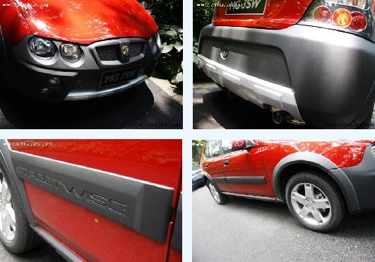 名爵MG3 SW外形中最引人注目的是其堅固粗大的與車身材質(zhì)截然不同的黑色塑料前后保險杠,車尾保險杠上還有“MG”的LOGO。輪眉上和車身側(cè)面都有黑色塑料防護(hù)條,即突出了個性,又可以在一些小刮蹭中,因為是塑料材質(zhì),并不會對車身造成的損傷,劃痕僅會在黑色的保險杠上留下一條輕微痕跡,也不會影響美觀。