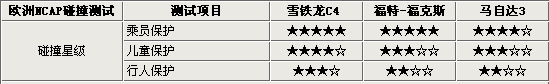歐洲NCAP評(píng)價(jià)一輛車型是否安全,是根據(jù)碰撞成績分?jǐn)?shù)來劃分星級(jí)的。雪鐵龍C4和?怂乖趯(duì)乘員保護(hù)方面均達(dá)了五顆星的好成績,馬自達(dá)3只達(dá)到了四顆星。在對(duì)兒童和行人保護(hù)方面,雪鐵龍C4的表現(xiàn)較為出色,而?怂购婉R自達(dá)3的成績還是不夠完美,都分別只達(dá)到了三顆星和兩顆星的成績。