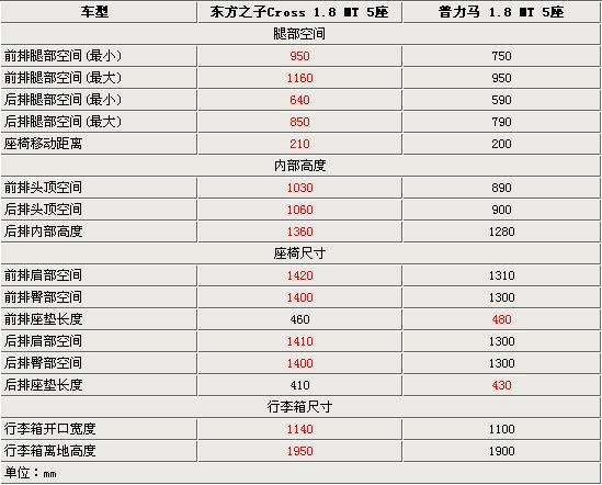 附:1.8L東方之子CROSS、海馬普力馬內(nèi)部尺寸詳表