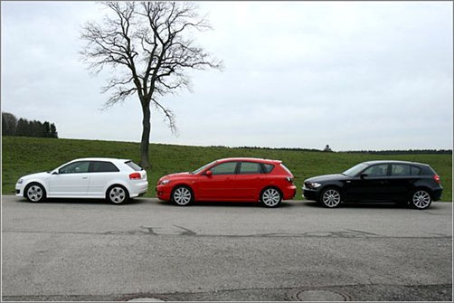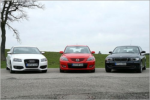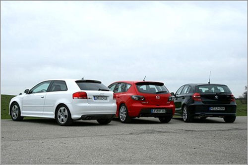 緊湊型轎車一向是很熱銷的車型,它們能提供最為豐富的動力選擇,琳瑯滿目的裝備和各種個性化選裝配置。如果錢袋較緊,但又想裝扮愛車,那么可以買一輛最基本配置的車型,剩下的交給改裝店去完成。當然最好還是直接買一部現(xiàn)成的成品車,既有火辣的外觀,又有出色的性能,整車的平衡也是最完美的,不過就是有點貴。我們從這些車中選出了三款強勁的小鋼炮,265馬力的奧迪S3,同樣265馬力的寶馬130i,還有260馬力的馬自達3 MPS。三輛車總功率加在一起超過了790馬力,把它們放在一起,外觀的差別很明顯。