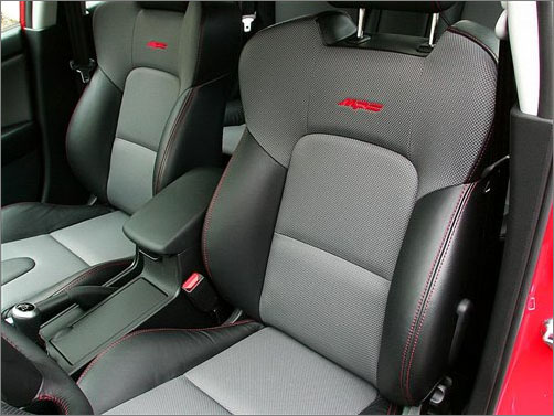 身著火紅色運動裝的馬自達3 MPS看起來也很自信,加大的中網(wǎng)和粗壯的排氣管都是它明顯的特征。馬自達也使用18英寸輪胎,寬度也達到215。奧迪的輪胎就遜多了,17寸205的規(guī)格讓它在瀝青路面上不那么自信,不過我們的測試車使用的是冬季胎,夏季胎同樣也是18英寸。