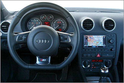 三款車的內(nèi)飾也有明顯的區(qū)別。寶馬的設計很雅致,深色的中控面板配上零星的鋁質(zhì)裝飾,總之它的內(nèi)飾最有運動感。奧迪的內(nèi)飾也同樣充滿運動氣息,真皮包裹的運動方向盤和手剎都用明顯的白線縫制,還有鋁制踏板,這些都是不可忽視的細節(jié)。馬自達3 MPS的內(nèi)飾也有鮮明的特點,黑色真皮和紅色縫線,座椅和踏板上的MPS字樣,這些都表明它不同于普通的馬自達3。儀表盤上紅色的字體和垂直的指針也有強烈的運動訴求。