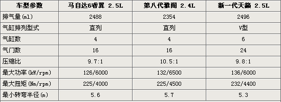 與天籟有著相同2.5L排量的馬自達(dá)6睿翼,氣缸排列型式則于雅閣相同為直列四缸,而它的最大輸出功率僅為126kW在三者中是最小的,但與雅閣相比在扭矩同為225Nm的情況下睿翼較低的轉(zhuǎn)速更適于在都市的街道中行駛。在馬自達(dá)6睿翼、雅閣與天籟(參數(shù)配置 圖庫)這三款車型中睿翼的壓縮比最低,而擁有9.7:1壓縮比的馬自達(dá)6睿翼可在國內(nèi)添加93標(biāo)號的汽油,這也就意味睿翼的車主可以此方面節(jié)省一些費(fèi)用。