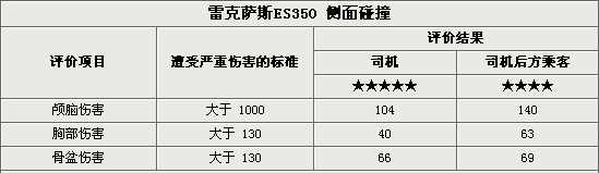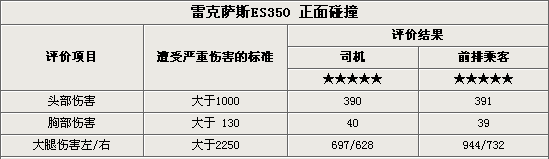 在正面碰撞測試中,標(biāo)準(zhǔn)規(guī)定如果頭部所受到的傷害值大于1000,頭部遭受嚴(yán)重?fù)p傷的機(jī)會將會比較高。但是雷克薩斯ES350的實際測試中,前方兩個假人的測試數(shù)值僅為390和391,明顯低于可能造成嚴(yán)重?fù)p傷的標(biāo)準(zhǔn);同樣在正面碰撞測試中位于駕駛席及副駕駛席上的假人在胸部、腿部所受到的傷害值也都遠(yuǎn)遠(yuǎn)低于“嚴(yán)重?fù)p傷”的臨界點(diǎn),駕乘人員在這項碰撞測試中所受到的傷害幾率低于標(biāo)準(zhǔn)值近3倍。因此,美國高速公路安全局對ES350駕駛席與前排乘客的正面測試給予了綜合評定5星的成績,該級別的評定代表了當(dāng)這類事故發(fā)生時,前排的駕乘人員僅有10%或更小的機(jī)會受到重傷。
