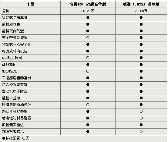 同樣注重安全的兩款車型,在此項對比中差距不大,均提供了較為完備的各項安全系統(tǒng)。主動及被動安全配置兩車也一應俱全,兩車的安全系數(shù)相比同級車型已大大提高。明銳更加注重自身的安全系統(tǒng)的配置,而MG7則擁有更全面的人性化提示系統(tǒng)。兩者此項對決將由價格的微弱差距來體現(xiàn)了。