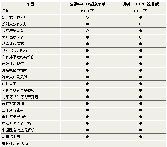 相比兩車的外形及尺寸,剛剛上市的AT版名爵MG7在軸距及整車長度上均有優(yōu)勢,而明銳則在車身寬度及高度方面面擁有更多空間。而在其他方面的比較中,除MG7的車體較明銳要重80KG外,基本沒有太多區(qū)別,兩車均表現(xiàn)良好。