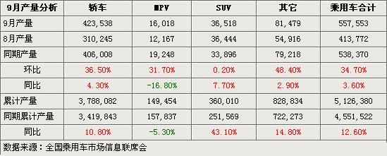 2008年9月,國(guó)內(nèi)乘用車(chē)產(chǎn)量總計(jì)為557553臺(tái),同比增長(zhǎng)了3.6%。與乘用車(chē)在同年8月份所創(chuàng)出的413772臺(tái)的總體產(chǎn)量相比增加了34.7%,而這也使2008年9月繼3月及6月份后,成為了年內(nèi)第三個(gè)環(huán)比呈正值增長(zhǎng)的自然月。