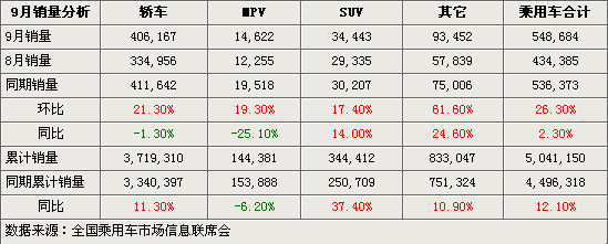 乘用車(chē)在9月全國(guó)的銷(xiāo)量為548684臺(tái),環(huán)比增長(zhǎng)了26.3%,同比增長(zhǎng)2.3%。在部分微客生產(chǎn)廠家取消高溫假恢復(fù)生產(chǎn)銷(xiāo)售后,以微客為主要組成部分的其它車(chē)型成為了2008年9月汽車(chē)產(chǎn)/銷(xiāo)環(huán)比增長(zhǎng)最大的一類車(chē)型。