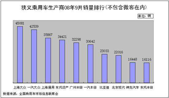 國(guó)內(nèi)9月份狹義乘用車(chē)生產(chǎn)商銷(xiāo)量排行的前三名依舊被上海大眾、一汽大眾與上海通用奪得。由上海大眾與一汽大眾所組成的大眾軍團(tuán),依舊盤(pán)踞著狹義乘用車(chē)生產(chǎn)商銷(xiāo)量排行冠亞軍的稱號(hào),延續(xù)著上個(gè)月的領(lǐng)先優(yōu)勢(shì),而上海通用則以35867臺(tái)的銷(xiāo)量名列第三。其中,自主汽車(chē)品牌比亞迪在2008年9月的排行中格外引人注目,以23033臺(tái)的成績(jī)首次在年內(nèi)晉身狹義乘用車(chē)生產(chǎn)商銷(xiāo)量前十的排行,名列第七位。