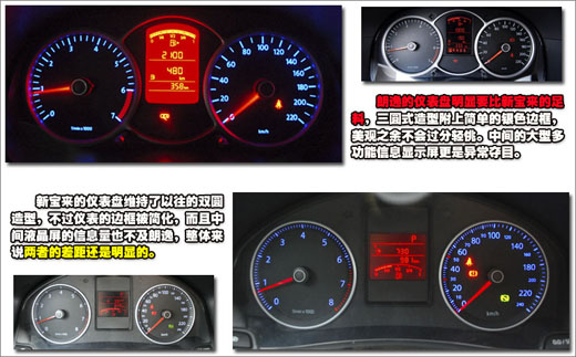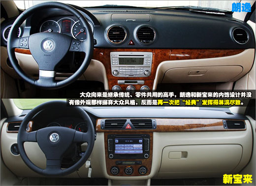 朗逸和新寶來的內飾基調一致,主要的差別在仿桃木面板的形狀、空調出風口和音響面板的色調?紤]到目標客戶的年齡區(qū)域,兩者都采用了大面積的仿桃木裝飾,美觀與否見仁見智,但對比起來的話筆者認為新寶來的黑色音響面板跟仿桃木裝飾更為協(xié)調。