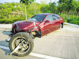 當日下午4時許,記者來到事發(fā)地點,看到一輛小轎車半個車身騎在人行道上,車頭被撞凹,其左側受損嚴重。左前輪脫離汽車立在車旁,其它3個車輪則不同程度受損。車內的安全氣囊已經彈出。在車旁,一根10多米高的路燈柱被撞斷。同時被撞斷的還有一塊印著“30”的限速牌。