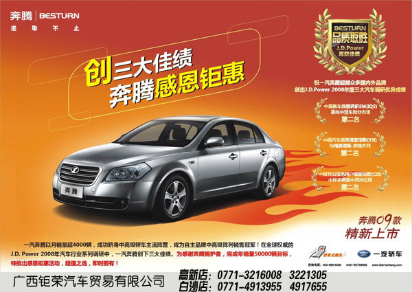 一汽奔騰以月銷量超過4000輛,成功躋身中高級轎車主流陣營,成為自主品牌中高級陣列銷售冠軍!在全球權(quán)威的J.D.Power 2008年汽車行業(yè)系列調(diào)研中,一汽奔騰創(chuàng)下三大佳績。為感謝奔騰擁護(hù)者,完成年銷量50000輛目標(biāo),特推出感恩鉅惠活動,部分09款精英特裝版車型促銷火熱進(jìn)行中!超值之選,即時擁有!