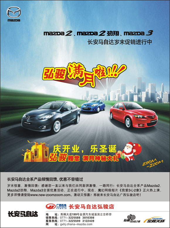 (廣西汽車網(wǎng) 訊)為了慶祝長安馬自達(dá)廣西第二家4S店開業(yè)一個月,長安馬自達(dá)弘駿店對旗下全系車型做歲末促銷活動。具體優(yōu)惠請聯(lián)系弘駿4S店。