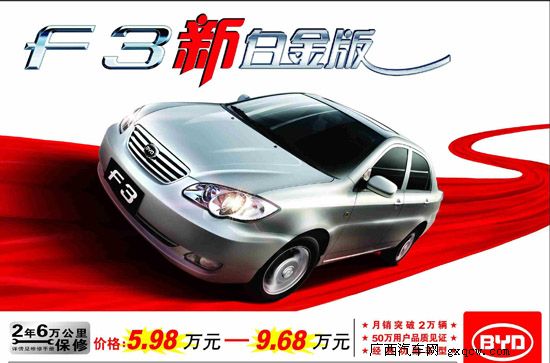 據(jù)了解,繼10月月銷破3萬之后,11月F3全系車型銷量達到31986輛,再創(chuàng)歷史新高;F3新白金版借廣州車展適時推出,力助F3新目標——月銷4萬輛的實現(xiàn)。比亞迪經(jīng)典暢銷車型F3新白金版的推出,增加了比亞迪汽車繼續(xù)創(chuàng)造奇跡的砝碼,相信隨著比亞迪汽車50萬保有量的口碑傳承,4萬、5萬的目標將不再遙遠。