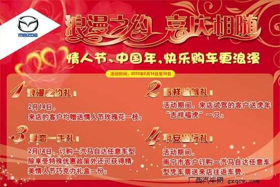 2010年的情人節(jié)即將來臨,如果你不想再吃老套的西餐,不想再到常去的電影院,那不妨與汽車談次戀愛,與心愛的人展開一段“汽車與愛情”的浪漫之旅,獨享二人世界的愜意。今年的情人節(jié),鑫廣達一汽馬自達與您共享浪漫之約!情人節(jié)、中國年,歡樂購車更浪漫!