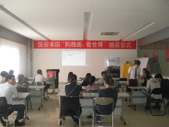 廣汽本田銷量突破200萬,雅閣銷量突破100萬之機(jī),為感恩用戶對雅閣品牌的支持,廣汽本田特舉辦了“購雅閣、看世博”的系列活動,應(yīng)廠家要求和廣大客戶的關(guān)注,5月8日下午15:00,恒安本田二樓VIP室,進(jìn)行了“購雅閣、看世博”抽獎儀式,十多組近期購買雅閣的客戶親自參與了此次活動,大家心里懸著的一塊“大石頭”終于落地了!