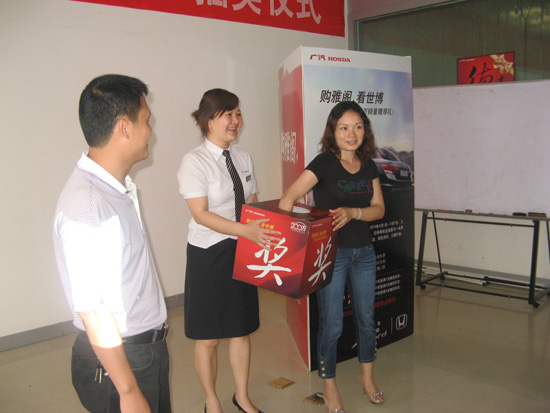 抽獎監(jiān)督人先進(jìn)行抽獎券查驗、抽獎券信息核對、抽獎券數(shù)量清點,隨后抽獎監(jiān)督將抽獎券全部放入抽獎箱,抽獎嘉賓隨機(jī)抽出4張抽獎券,這樣4名世博之旅的車主就誕生了!雖然名額有限、機(jī)會有限,但大部分客戶還是非常期待此次抽獎的,大家都想碰碰運氣,究竟“花落誰家”?也許自己就是這個幸運兒,恒安本田的工作人員還未每位到場客戶準(zhǔn)備了精美的禮品,從每位到場客戶臉上的笑容我們不難看出,獎項抽出來了,自己雖然沒中獎,但大家的內(nèi)心一樣充滿喜悅。