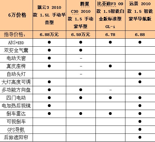 舒適方面,如果以旗云3的6.88萬元華貴型作為比較,那么它的舒適配置很齊全,電動車窗,行車電腦顯示屏,倒車?yán)走_(dá),真皮座椅,多功能方向盤,后視鏡加熱一應(yīng)俱全。對比來看,騰翼C30沒有真皮座椅,沒有電動天窗等等,性價比并不是特別高。比亞迪F3的6.78萬元舒適配置不是太齊全。作為比對來說應(yīng)該會有些吃虧,不過7.08萬元這款性價比是很高的。遠(yuǎn)景2010款主要賣點(diǎn)是GPS導(dǎo)航+可視倒車,除此之外后風(fēng)擋遮陽簾,自動頭燈以及大燈高度可調(diào)也是舒適賣點(diǎn)。