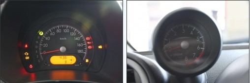更讓人驚喜的是儀表,奧拓的轉(zhuǎn)速表被單獨放置在中控臺左角,小表盤不僅給車內(nèi)增加了一些可愛氣氛,而且給速度儀表盤留下了較大布置空間,大大的獨立表盤顯示的是時速以及自動擋位,即便是戴眼鏡的駕駛員也不會擔(dān)心儀表讀取困難。而且對于自動擋而言,轉(zhuǎn)速表意義并不大,在沒有缺失的情況下讓位給速度儀表做法很聰明。