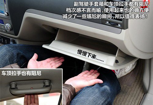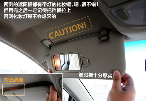 車內(nèi)雖然不如外面那么吸引人,顯得有些中庸和保守,但是實(shí)用性并不差。很多細(xì)節(jié)都能夠體現(xiàn)人性化的理念,比如帶有阻尼的手套箱,在自主品牌的同級(jí)別車?yán)锞秃苌僖,甚至車頂(shù)睦忠餐瑯訋в凶枘。帶有照明燈的遮陽板化妝鏡,雖然也是小東西,但確實(shí)給人的感覺不一樣。