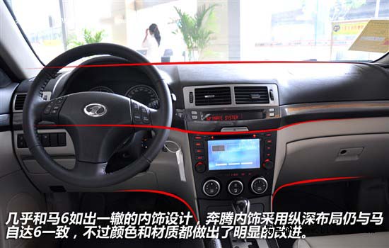 奔騰和馬自達6如出一致的內(nèi)飾設(shè)計透露出了兩者之間千絲萬縷的聯(lián)系,奔騰內(nèi)飾雖然在布局仍馬自達6一致,不過顏色和材質(zhì)都做出了明顯的改進。