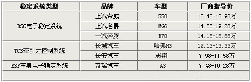 以上6款車有三款裝備了DSC動(dòng)態(tài)穩(wěn)定控制系統(tǒng),兩款車配備了TCS牽引力控制系統(tǒng),只有奇瑞A3裝備了ESP。六款車當(dāng)中榮威550、名爵MG6、奔騰B70和哈弗H3都只有高配版本車型才配備了穩(wěn)定系統(tǒng),低配車型均未配備,所以價(jià)格也略高。而長(zhǎng)安志翔和奇瑞A3就屬于十分厚道的兩款家用車了,雖然價(jià)格比較便宜,但是全系標(biāo)配這種行為,就已經(jīng)贏得了很多掌聲。