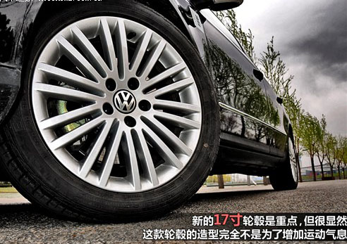 2011款邁騰在外觀上沒有太顯眼的變化,不過一眼看過去你總覺得它變得更動感了。為什么呢?原來邁騰更換了“大腳”,全新的235/45 R17輪胎搭配多幅條運動輪轂明顯增強了邁騰的運動感,也使自己在致勝、君威面前不再顯得那么寒酸。