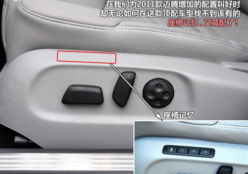 不過必須批評的是邁騰一方面在積極的增配,改善用戶體驗,另一方面還不忘簡配,之前出現(xiàn)在舒適型和豪華型上的座椅記憶功能在2011款全系中都被簡配掉了。