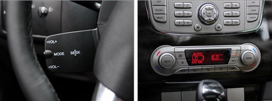 位于方向盤后方的音響調(diào)節(jié)旋鈕(左)空調(diào)系統(tǒng)已經(jīng)升級(jí)為雙區(qū)域控制系統(tǒng)(右)