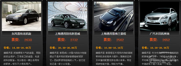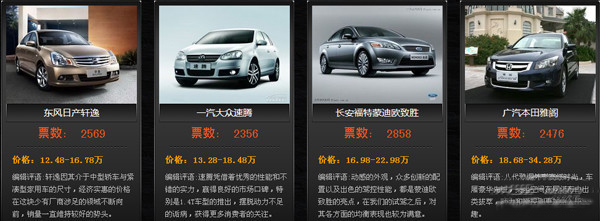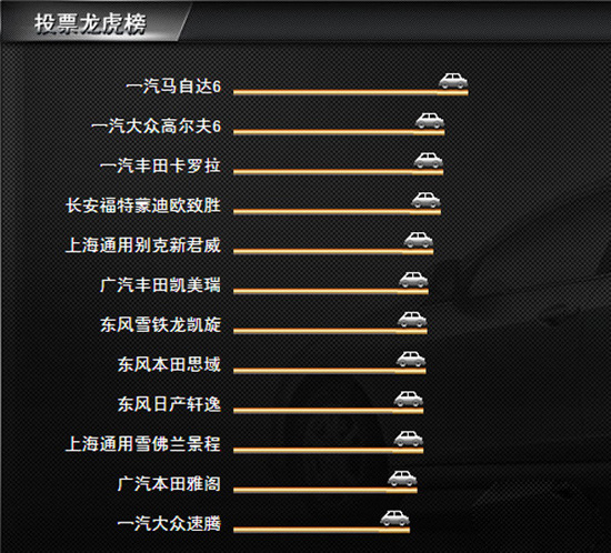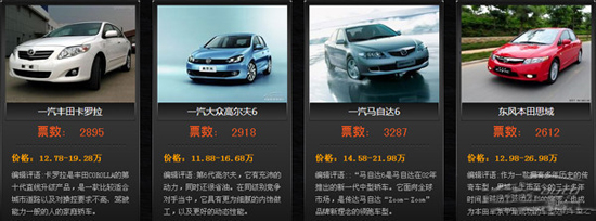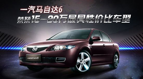 于2010年7月8日-23日由網(wǎng)友投票選出15-20萬最具性價比車型,參選的車型有本田思域、一汽馬自達6、豐田卡羅拉、別克新君威、豐田凱美瑞、速騰、雅閣等12款車型。一汽馬自達6以3287票當選最具性價比車型 。