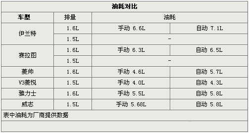 除了在購車時(shí)的優(yōu)惠以外,在日常的使用中,相對(duì)小的排量也會(huì)在燃油經(jīng)濟(jì)性上擁有一定優(yōu)勢(shì)。表中可以看出,東南汽車菱帥車型搭載1.6L發(fā)動(dòng)機(jī)手動(dòng)版油耗為4.6,自動(dòng)版油耗為5.7L,V3菱悅作為代替它的車型,搭載一款1.5L發(fā)動(dòng)機(jī),4.0L/4.3L的平均油耗進(jìn)步很明顯。伊蘭特和塞拉圖兩款車型曾放出消息稱會(huì)推出搭載1.5L發(fā)動(dòng)機(jī)的車型,但因?yàn)槟壳吧形赐瞥,廠商還未能提供有數(shù)據(jù)。