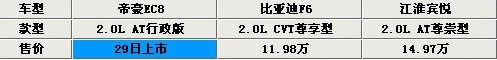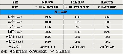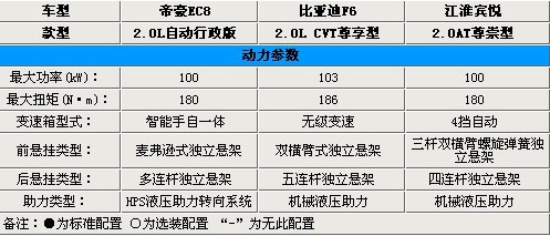 動(dòng)力方面,三款車均搭載了2.0L直四自然吸氣發(fā)動(dòng)機(jī),并且三款發(fā)動(dòng)機(jī)所帶來的功率和扭矩輸出數(shù)據(jù)也基本相同。帝豪EC8配備了智能手自一體變速箱,比亞迪F6配備了CVT無級(jí)變速器,而江淮賓悅卻只提供了4速自動(dòng)變速器。懸掛方面,三款車均配備了前后獨(dú)立懸掛的厚道配置。