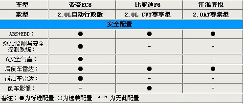 由于沒有配備過多科技含量較高的被動安全配置,三款車在安全方面做得只能算及格。其中表現(xiàn)比較出色的仍然是帝豪EC8,除了ABS+EBD、倒車?yán)走_(dá)等基本安全配置外,帝豪EC8還配備兩探頭式前泊車?yán)走_(dá),這樣的配置在10萬出頭的價位十分罕見。不過比亞迪F6配備了倒車影像,獨(dú)樹一幟的貼心配置讓F6有所加分。