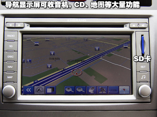中控臺主功能去配備了導(dǎo)航顯示屏,可以通過這里控制收音機,CD、地圖和導(dǎo)航等大量功能。另外,帝豪EC7-RV還配備了SD卡插槽,當(dāng)然里面已經(jīng)放置好了免費贈送的SD卡,方便使用者通過各種途徑娛樂。