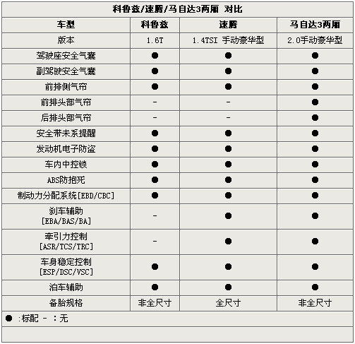 既要跑得快,又要夠安心,這都是一款成功的車(chē)型所必須具備的要素。安全部分新馬自達(dá)3兩廂版以非常明顯的優(yōu)勢(shì)勝出,前后排側(cè)向安全氣簾、剎車(chē)輔助系統(tǒng)以及牽引力控制系統(tǒng)等部分都是其優(yōu)勢(shì)所在。速騰輸在了安全氣囊,科魯茲盡管加入了ESC車(chē)身電子穩(wěn)定系統(tǒng),但卻不能完全彌補(bǔ)其他部分的不足。