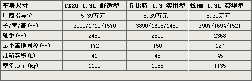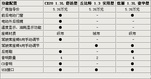 在功能配置方面,長安CX20與其他兩款車相比,優(yōu)勢則非常明顯,前后電動門窗、電動外后視鏡、車內電子信息顯示、6向駕駛席座椅調節(jié)等功能配置都沒有出現在丘比特和炫麗上。其中丘比特的配置最低,后雨刷、CD等實用的配置也沒有配備。