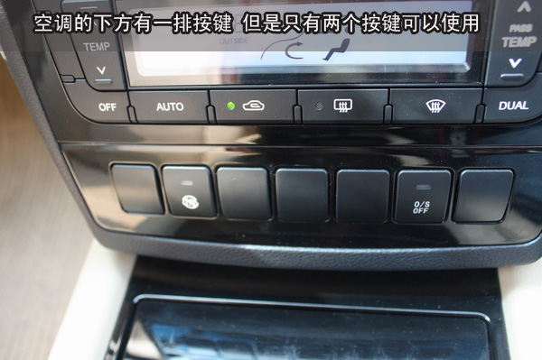 配備雙區(qū)恒溫自動空調(diào),操作簡單,沒有旋鈕,全部控制都是以按鍵的形式?照{(diào)的下方有一排按鍵,但是只有兩個按鍵可以使用,在2.4L的高配車型上也是如此。