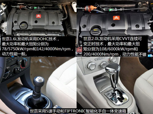 東風(fēng)雪鐵龍世嘉在動(dòng)力方面采用1.6L和2.0L兩款發(fā)動(dòng)機(jī),其中1.6L發(fā)動(dòng)機(jī)與愛麗舍、標(biāo)致206 1.6的1.6L發(fā)動(dòng)機(jī)是同一款發(fā)動(dòng)機(jī),這款發(fā)動(dòng)機(jī)技術(shù)不先進(jìn),但還算成熟,用在愛麗舍及標(biāo)致206上很省油,但是用在世嘉這么大的車身上,就顯得小馬拉大車了;2.0L發(fā)動(dòng)機(jī)采用了CVVT連續(xù)可變正時(shí)氣門技術(shù)。在變速箱方面,世嘉采用5速手動(dòng)和TIPTRONIC智能化手自一體變速箱,其手自一體變速器實(shí)質(zhì)上是曾用在307等車型上的4速手自一體變速箱,雖然技術(shù)較老而且檔位較少,平順性、燃油經(jīng)濟(jì)性都一般,但質(zhì)量較為可靠。