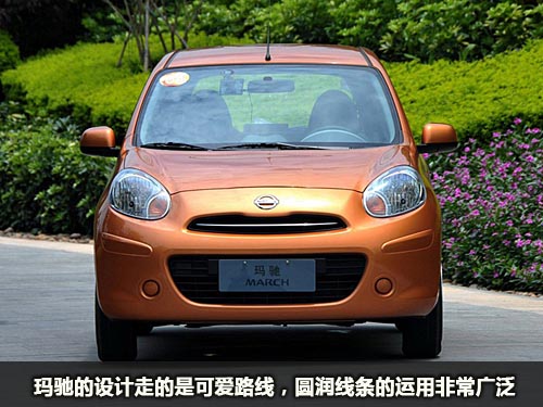 瑪馳的設計走的是乖巧線,從外形來看,瑪馳依然維持上一代車型的柔和、圓潤車體造型。就個性而言,瑪馳與上一代車型相比有所弱化。在該車的車頭設計中,之前的雷諾式對稱散熱格柵已被上下銜接的梯形結構所取代,這與Mini有幾分相像,旕Y的橢圓形大燈更符合大眾口味,同時與散熱格柵的搭配也很是和諧,卡通感十足。