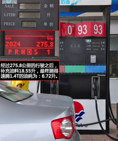 測試油耗還是使用經(jīng)常能碰到的路況進(jìn)行測試,其中包括城市擁堵路段,城市環(huán)路,高速公路,國道,鄉(xiāng)村路段以及山路。是目前實(shí)現(xiàn)起來最簡單、數(shù)據(jù)最公證的測試方法。行駛了接近276公里之后,我們又將油料補(bǔ)充至瓶口加油機(jī)上顯示的就是此次油耗測試的耗油量為:18.55升。最終這臺速騰1.4T車型在搭載三人的情況下平均油耗僅為6.72升。