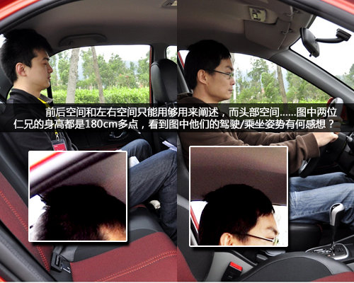 “小弟”級(jí)別的車身尺寸導(dǎo)致了車內(nèi)空間的狹小,比如上圖中兩位身高均在180cm左右的空間展示者,坐入其中實(shí)在是憋屈得很。