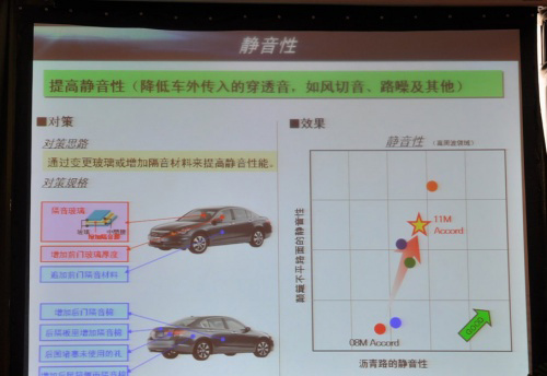 2011款雅閣的外觀改變不大,卻在看不到的地方進(jìn)行了很多調(diào)整,很多消費(fèi)者反饋第八代雅閣的靜音性不是非常理想,雅閣的工程師為2011款雅閣設(shè)計(jì)了很多隔音措施。前風(fēng)擋和前門(mén)的玻璃更換為更厚的隔音玻璃,四個(gè)車(chē)門(mén)、后備箱和后葉子板處增加了隔音棉,并且將車(chē)尾部分未使用到的預(yù)留孔位進(jìn)行了填堵,整個(gè)車(chē)廂內(nèi)的安靜程度有所提升,這在后面的駕駛環(huán)節(jié)會(huì)有所體驗(yàn)。