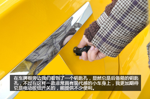尾部還算簡潔,一副上揚的笑臉姿態(tài),鍍鉻橫條主要就是為了裝飾出豪華效果,在車牌框旁邊我們看到了一個鑰匙孔,顯然它是后備箱的鑰匙孔,不過在這樣一款非常具有現(xiàn)代感的小車身上,我更加期待它是電動按鈕開關(guān)的,能提供不少便利。